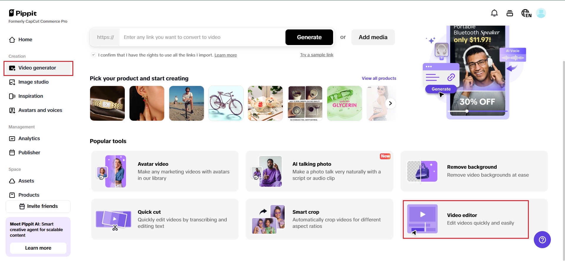 To get started, launch Pippit and choose the “Video editor” option from the “Video generator” screen. You may upload the video you wish to modify by browsing your device or by dragging and dropping your video file into the timeline. With this configuration, you can easily access your video and get it ready for splitting.